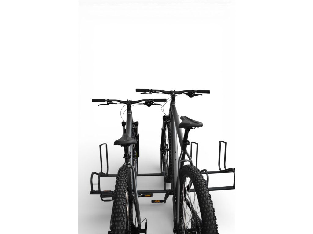 Ideální řešení parkování kol v bytovém domě. Výškové střídání držáků a možnost natočení šetří místo v kolárně.